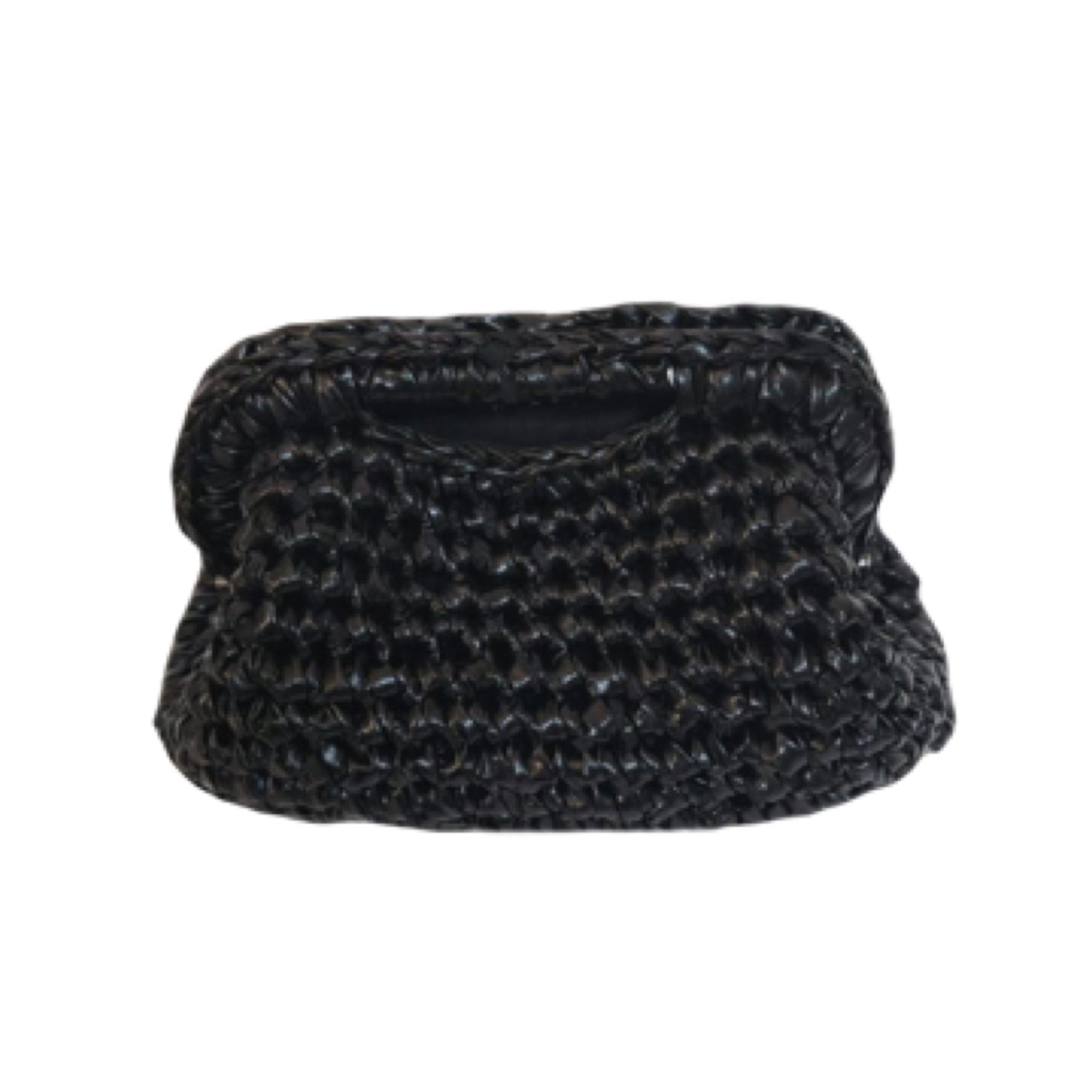 Una mini clutch artigianale in ecopelle nera intrecciata, compatta ma capiente, perfetta per