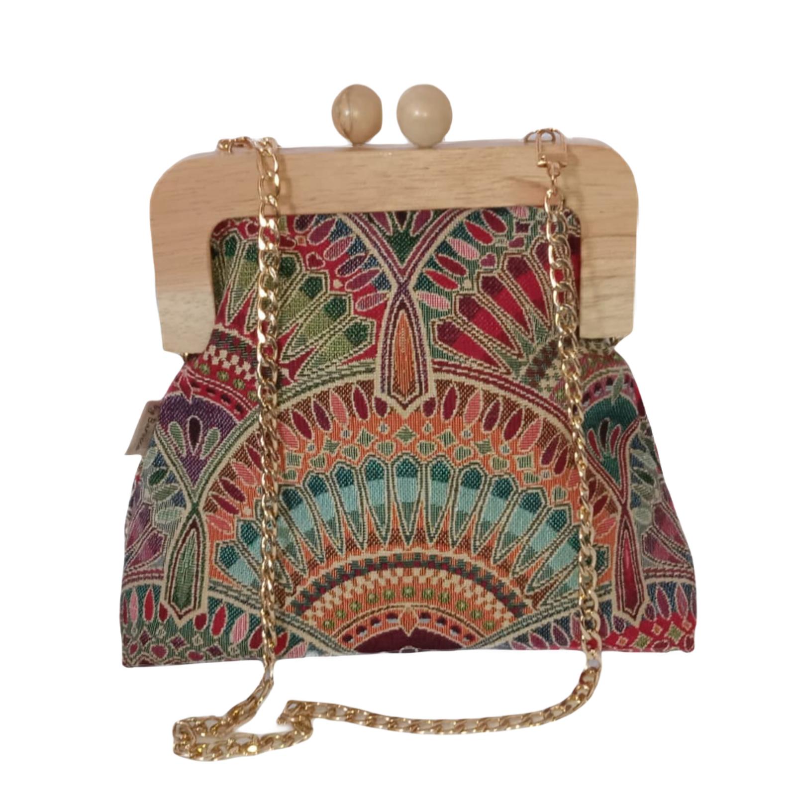 Borsa clic clac artigianale realizzata con tessuto gobelin di alta qualità e caratterizzata da una raffinata fantasia etnica multicolore. La chiusura rigida in legno naturale dona un tocco elegante e contemporaneo, rendendo questa borsa un accessorio originale e di forte personalità.