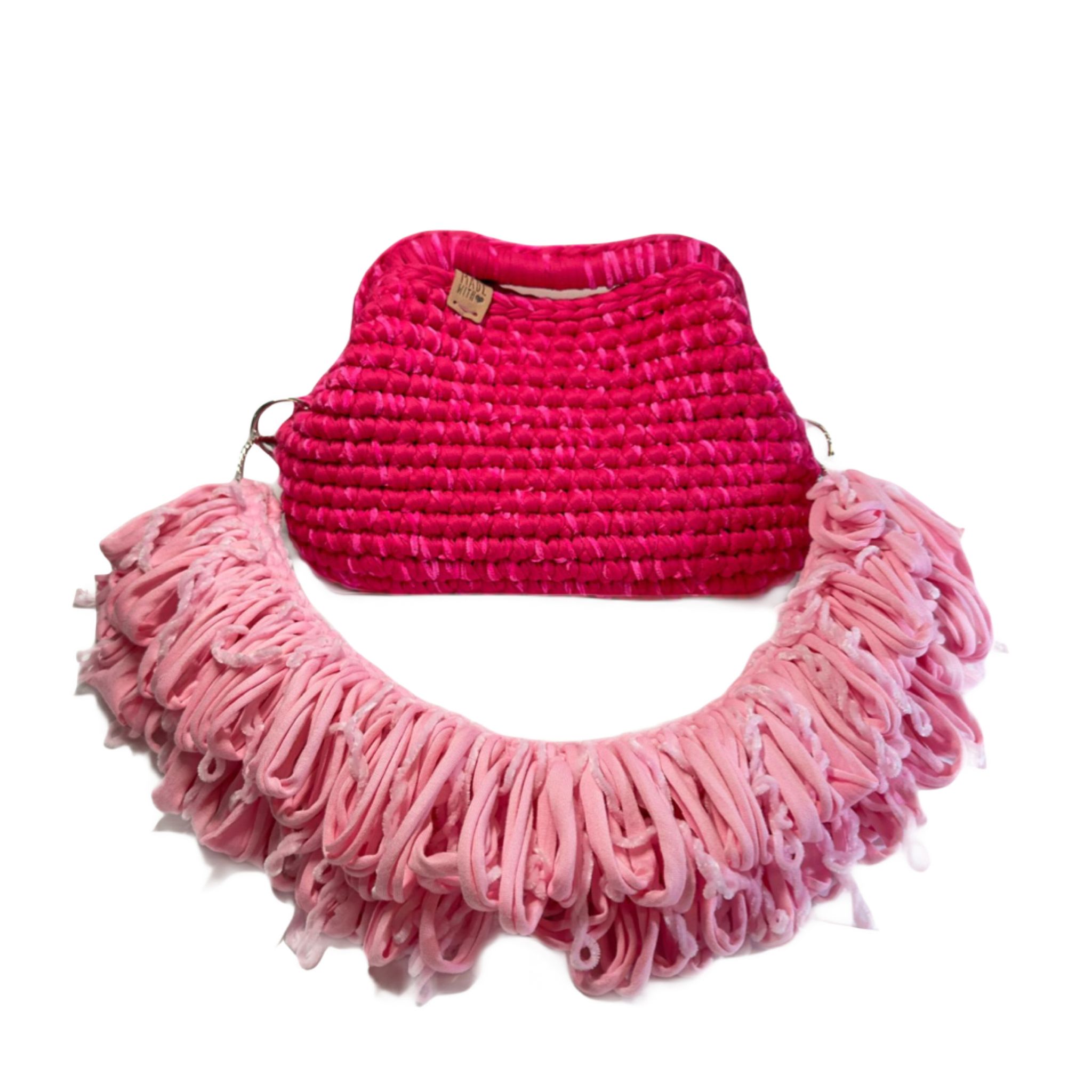 Borsa artigianale realizzata a mano in filato di lycra e ciniglia.