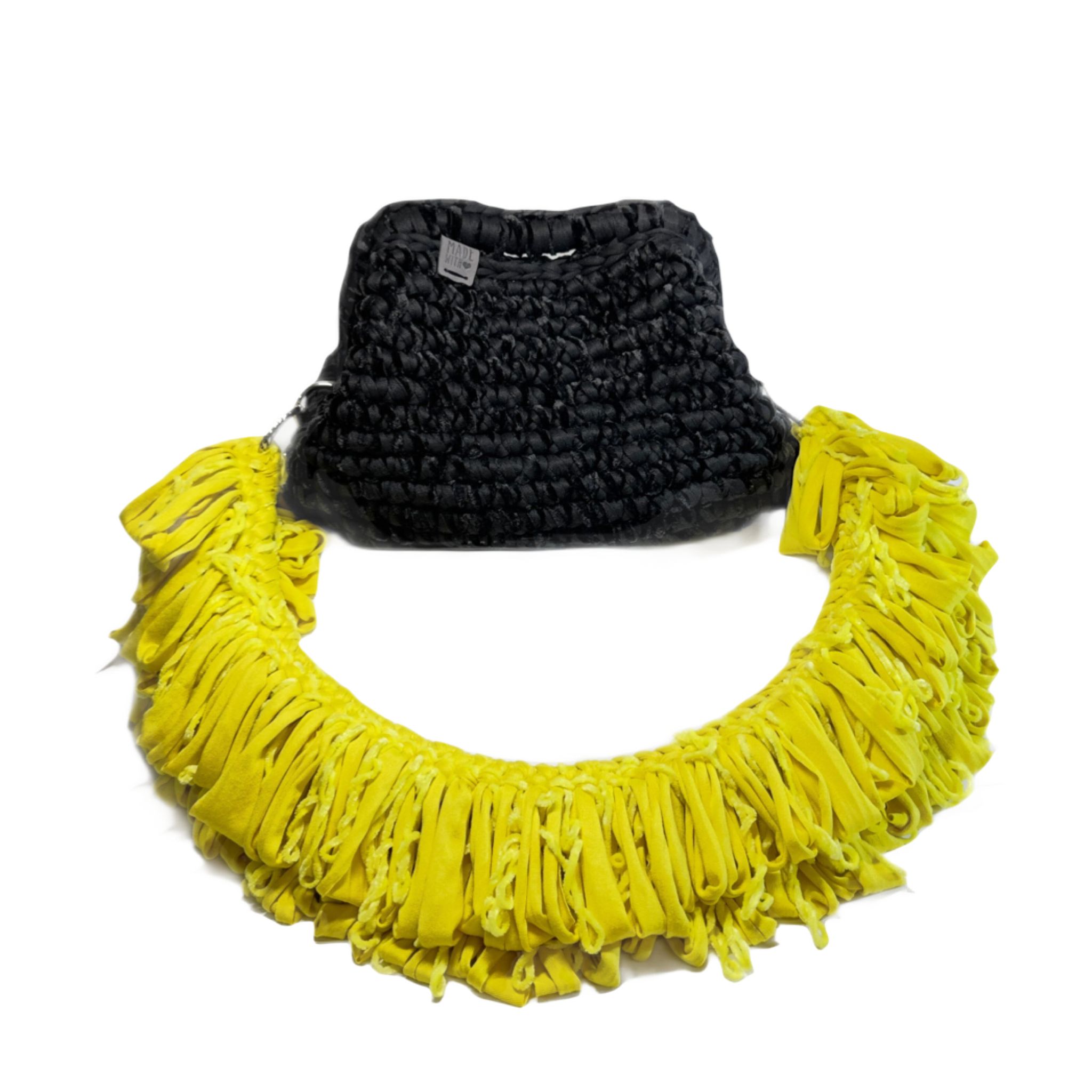 Borsa artigianale realizzata a mano in filato di lycra e ciniglia.