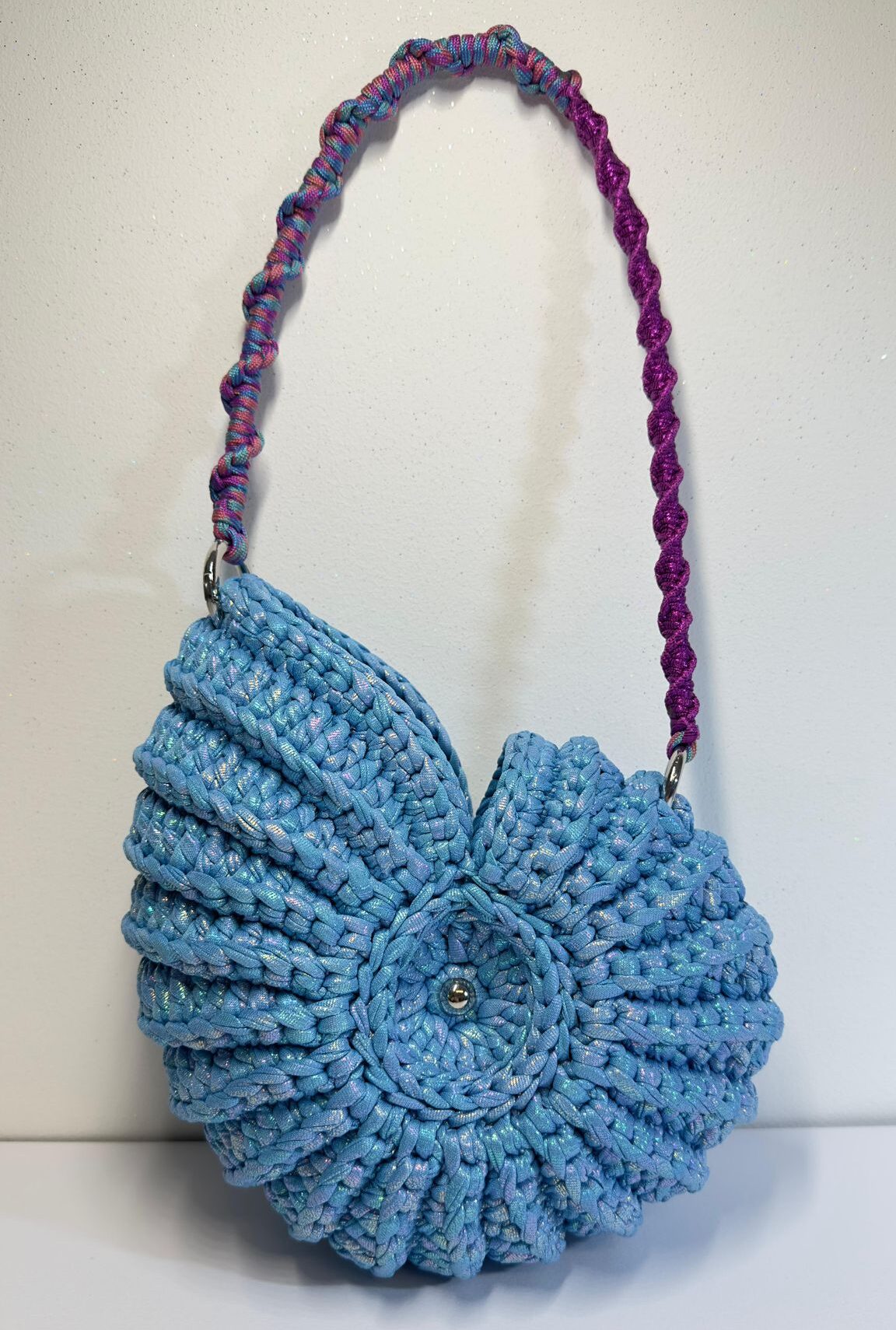 Aggiungi un tocco di stile unico ai tuoi outfit con questa borsa artigianale realizzata a mano in filato di lycra lamè, luminosa e resistente. Il design a conchiglia e tridimensionale valorizza la lavorazione accurata, mentre il manico in macramè intrecciato a mano dona carattere e solidità, rendendo la borsa comoda da indossare e originale nel look.