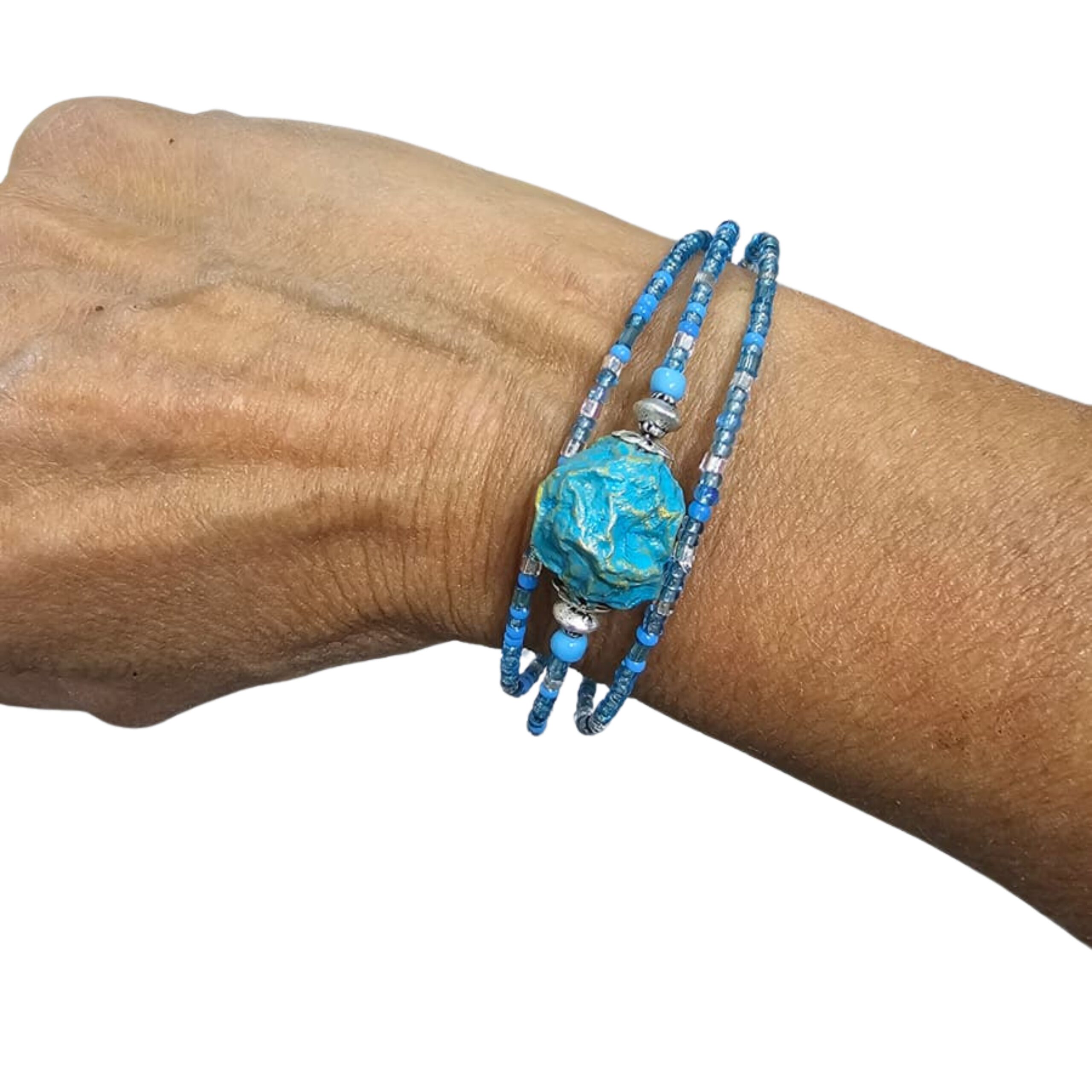 Bracciale artigianale realizzato a mano con perline in autentico vetro di Murano nelle tonalità del blu e dell’azzurro, abbinate a una perla centrale in cartapesta dipinta, unica nel suo genere. Un gioiello leggero e originale che unisce la tradizione dell’artigianato artistico italiano a un design contemporaneo ed elegante.