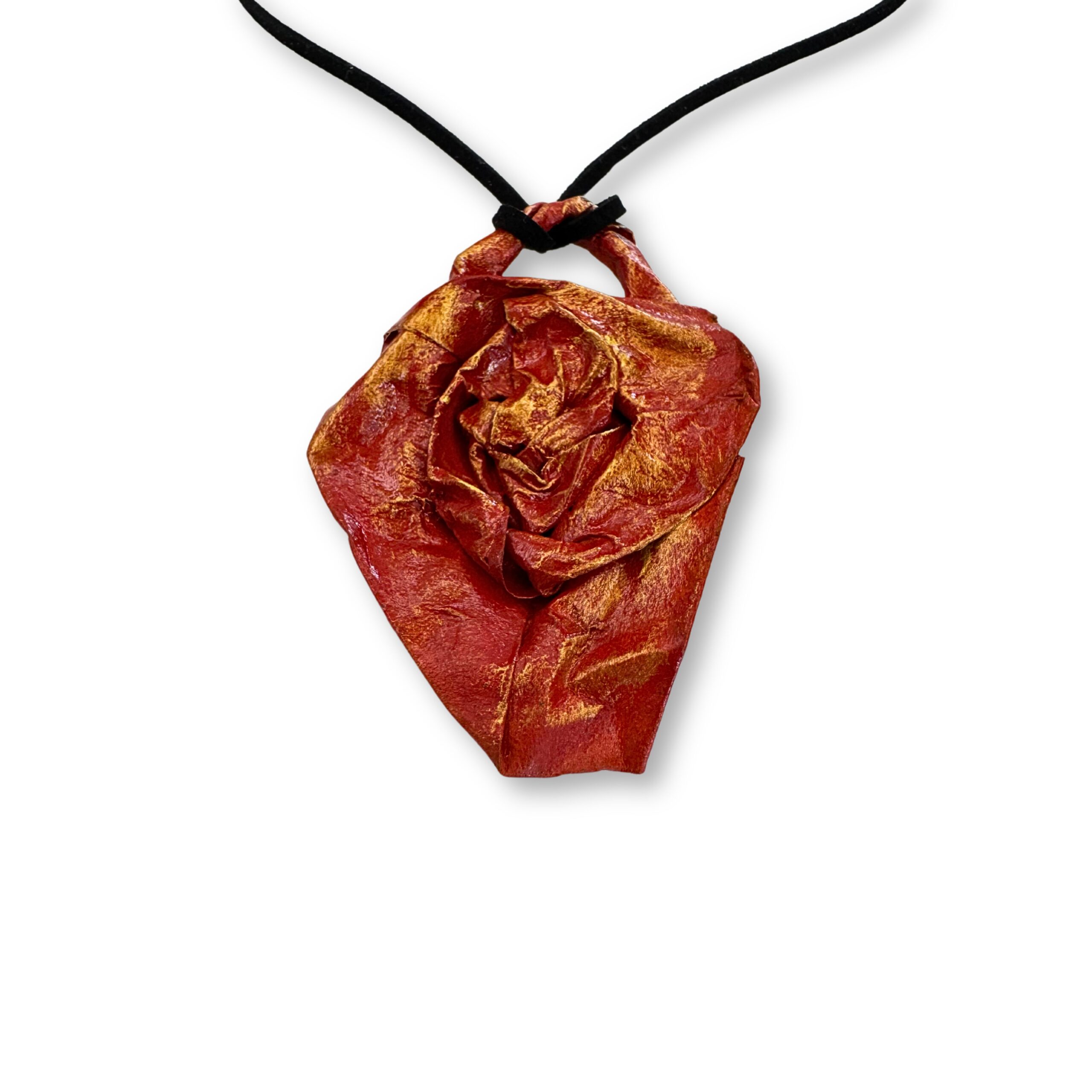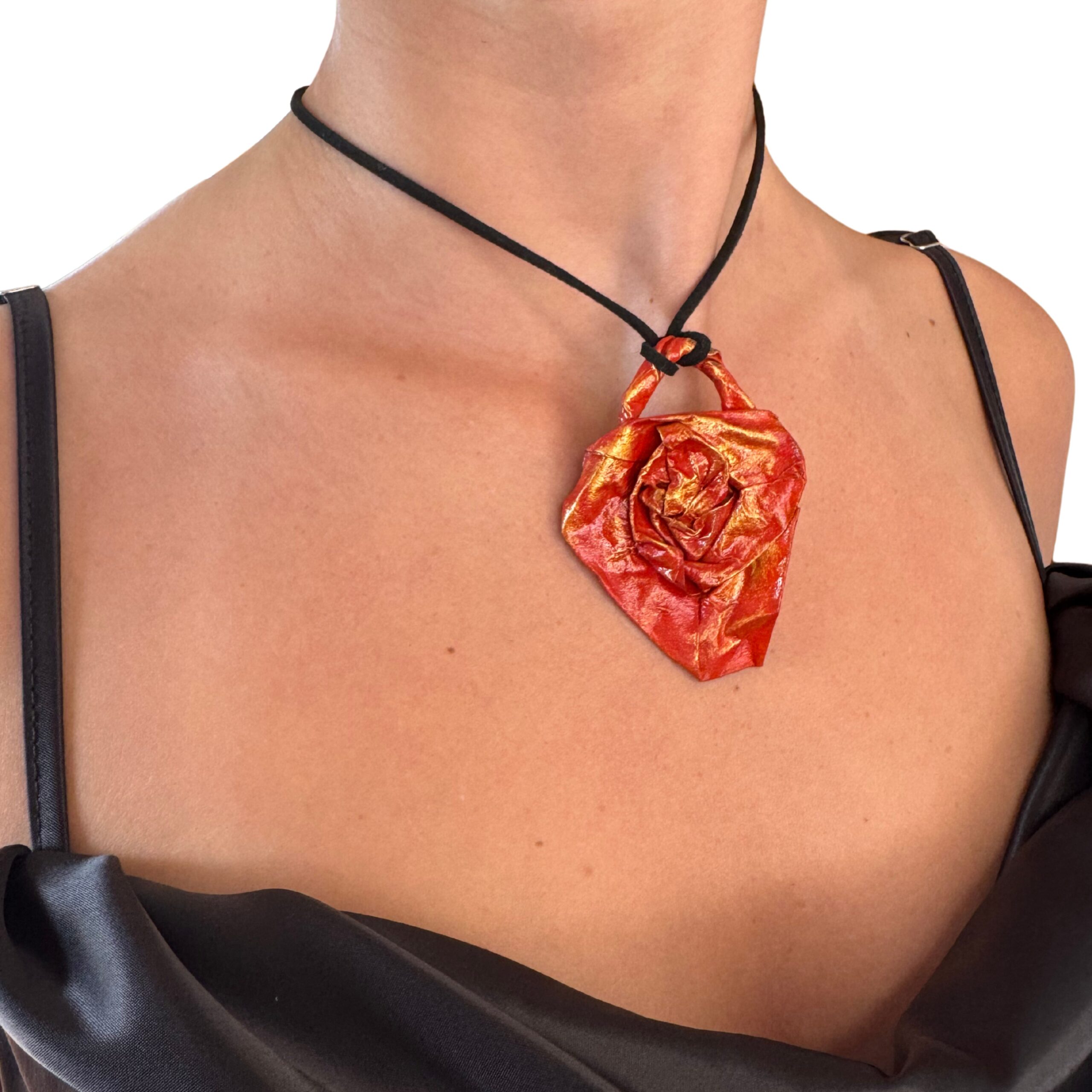 Questa collana artigianale in cartapesta è un gioiello unico, realizzato interamente a mano secondo tecniche tradizionali reinterpretate in chiave contemporanea. Il pendente in cartapesta, leggero ma resistente, si distingue per la sua forma scultorea e materica, capace di catturare lo sguardo e valorizzare qualsiasi outfit.