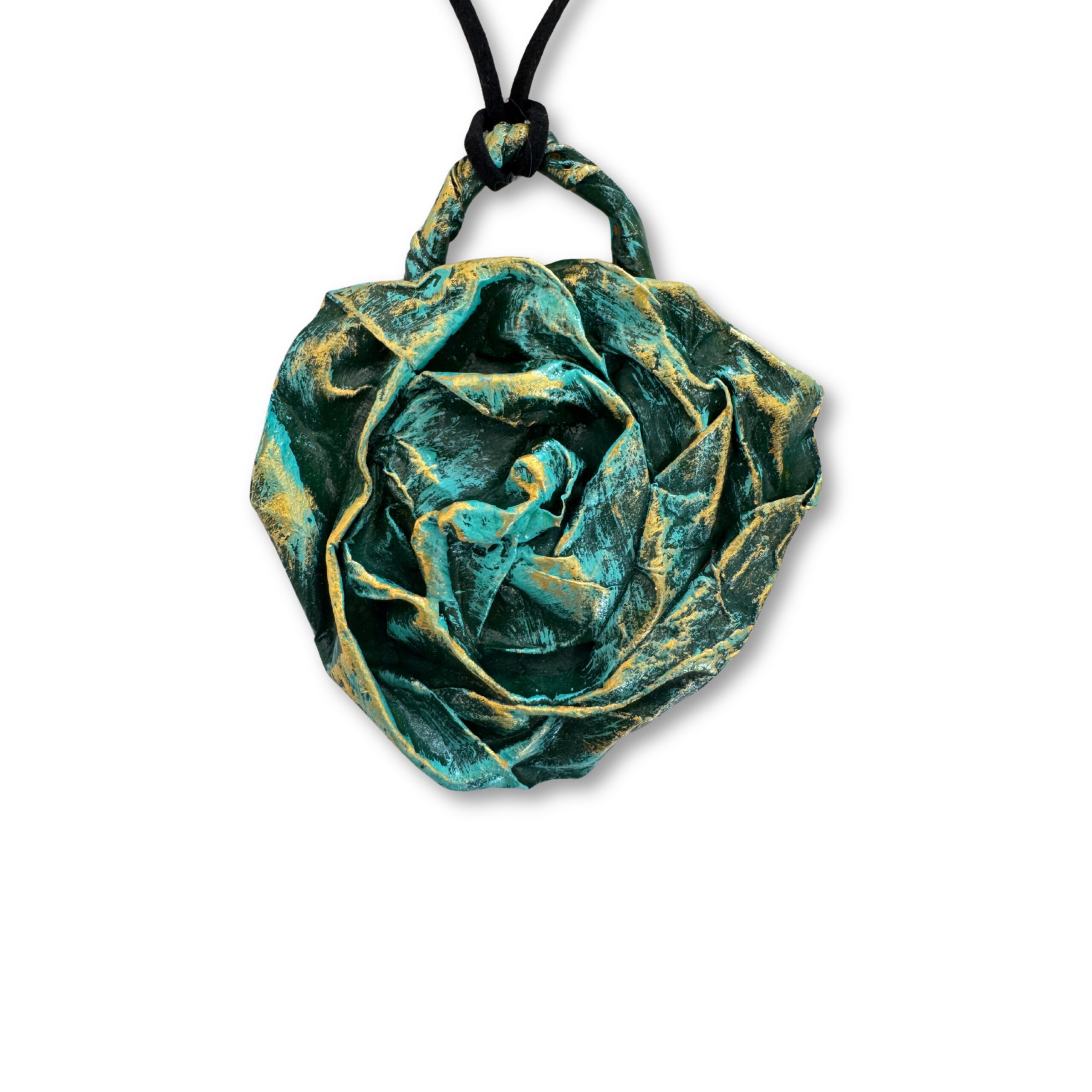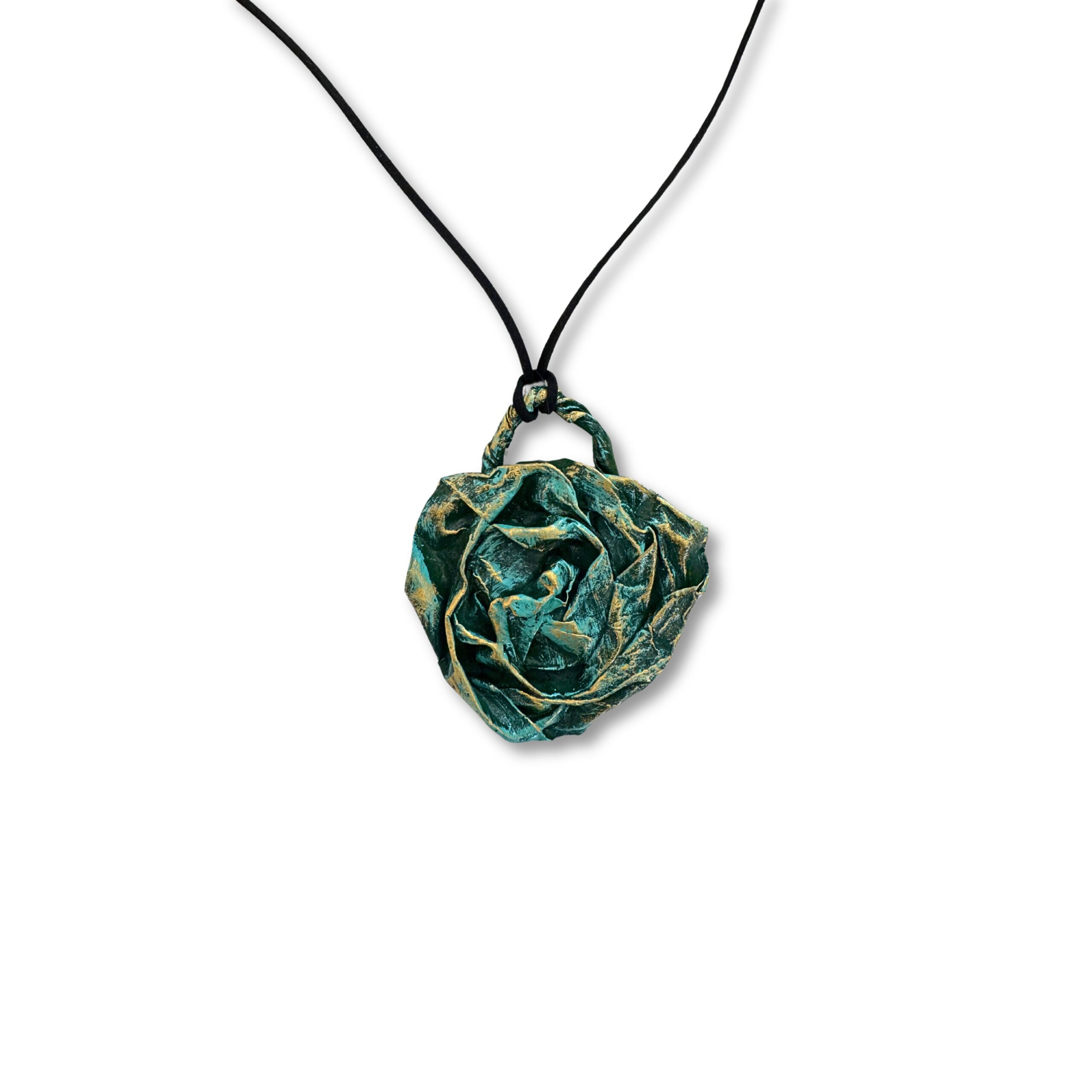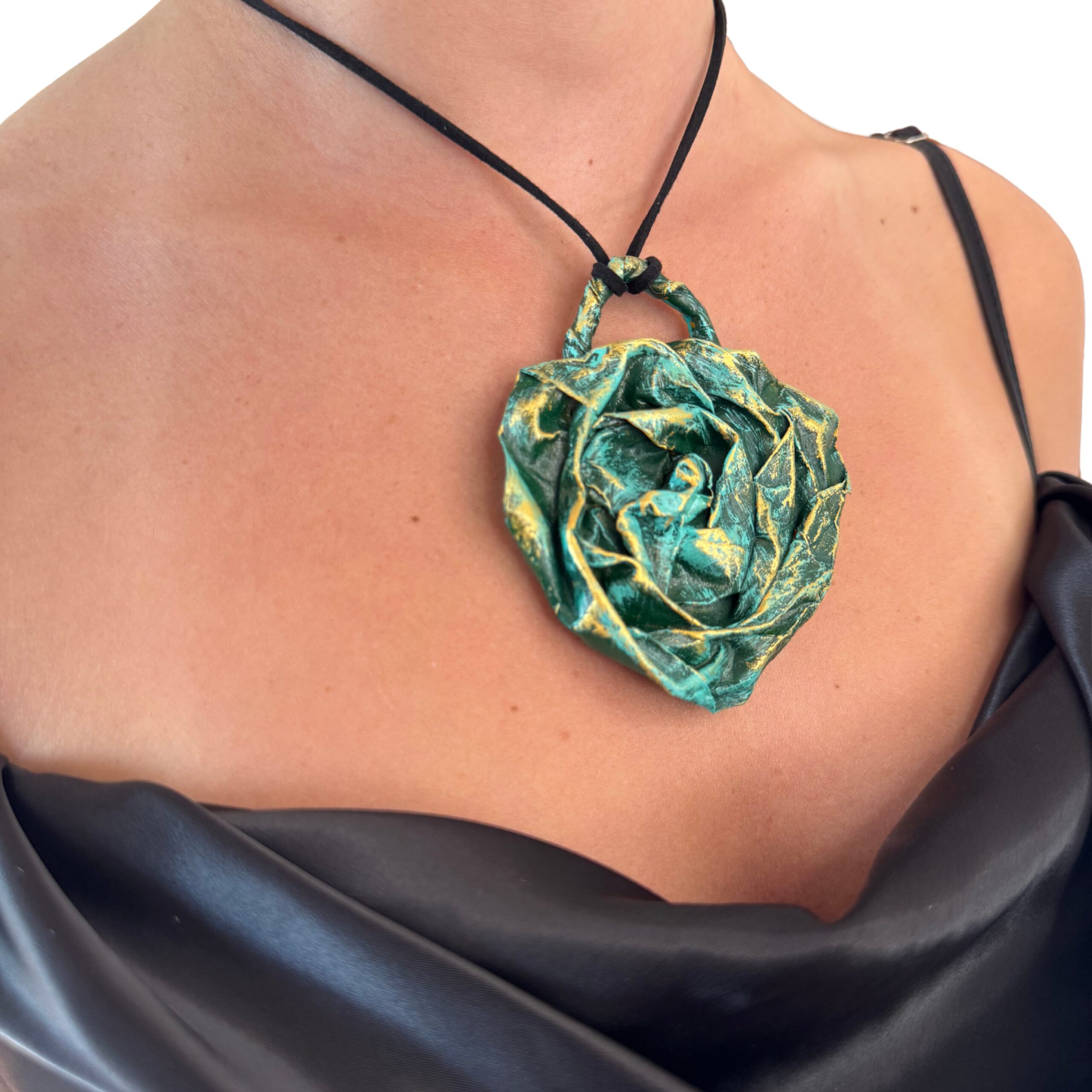 La collana è completata da un cordino nero regolabile, che permette di adattare facilmente la lunghezza e garantisce comfort durante l’uso quotidiano. La cartapesta, materiale sostenibile e creativo, rende ogni pezzo irripetibile, con leggere variazioni di texture e forma che testimoniano l’autenticità del lavoro artigianale.