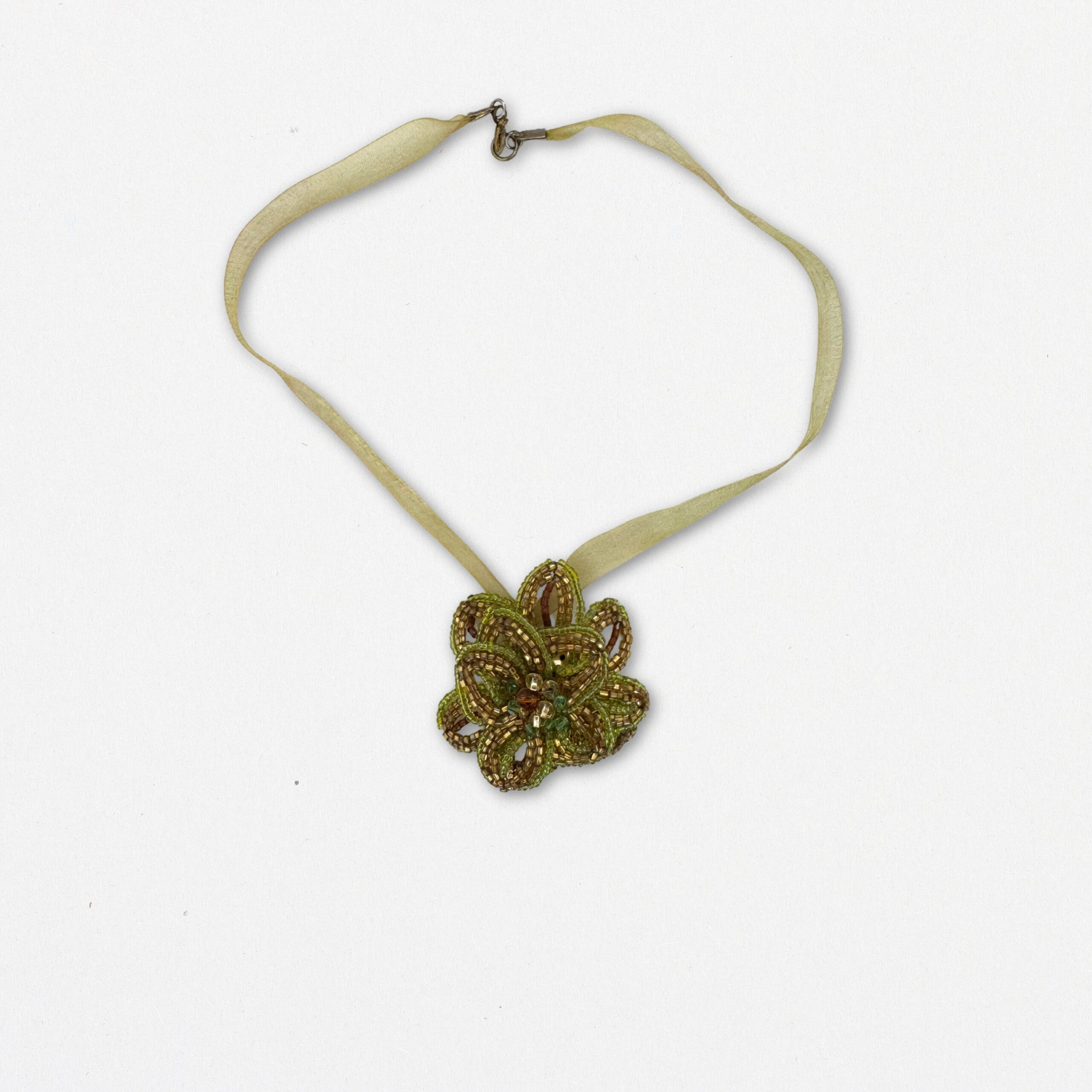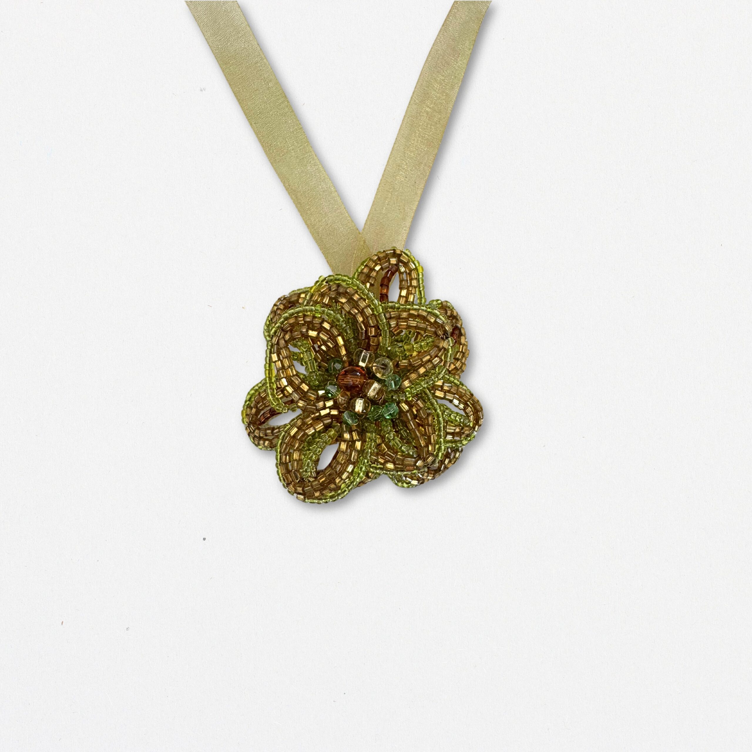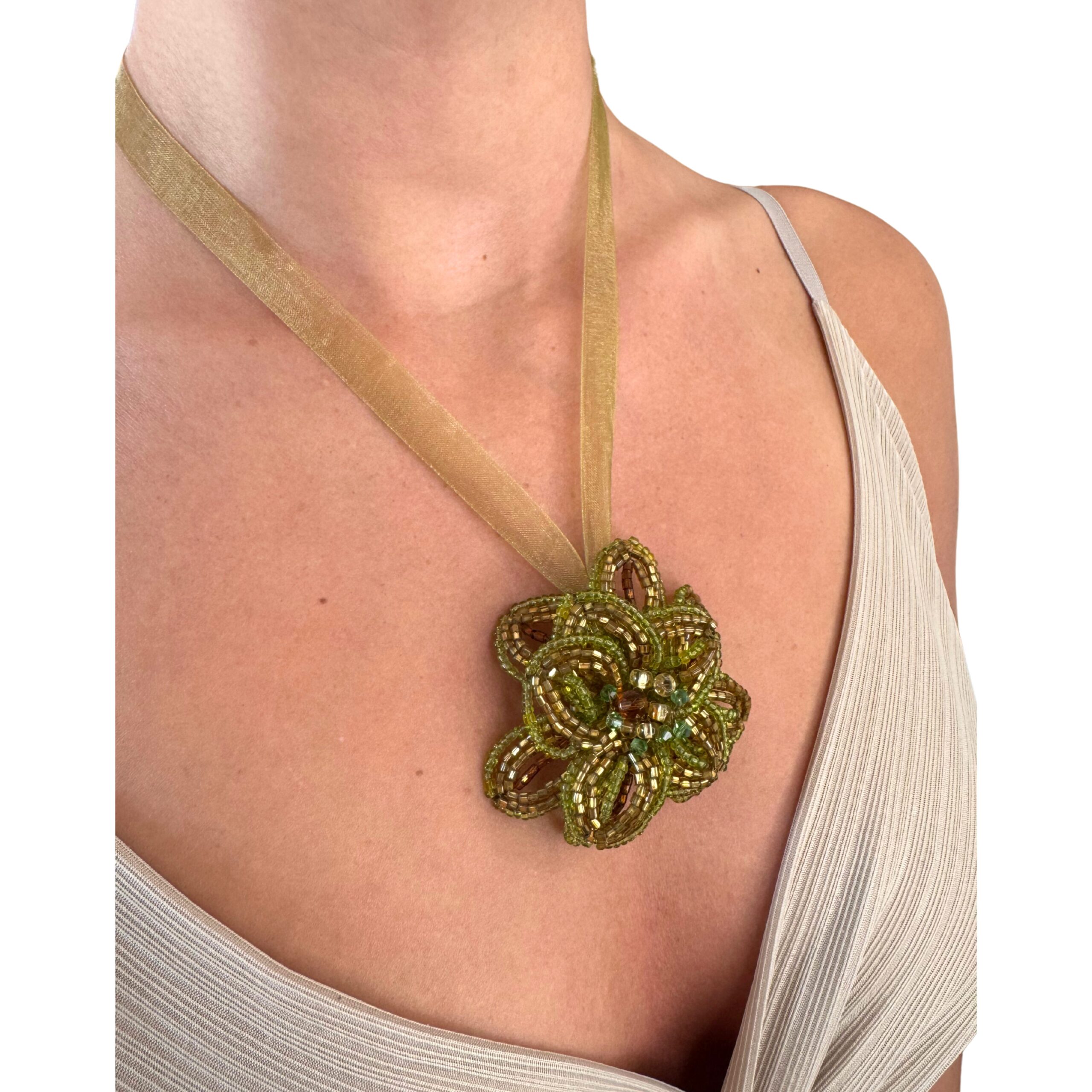 Versatile ed elegante, questa collana trasformabile in spilla in vetro di Murano è un gioiello artigianale dal design raffinato e multifunzionale. Realizzata a mano con perline in vetro di Murano, presenta un pendente centrale a forma floreale, ricco di dettagli e sfumature luminose nei toni del verde e dell’oro.