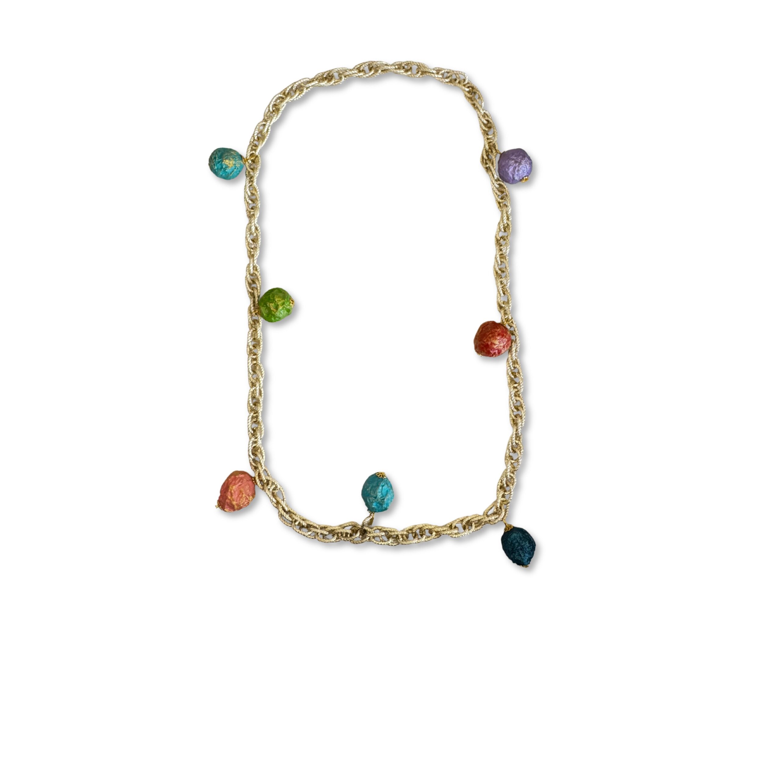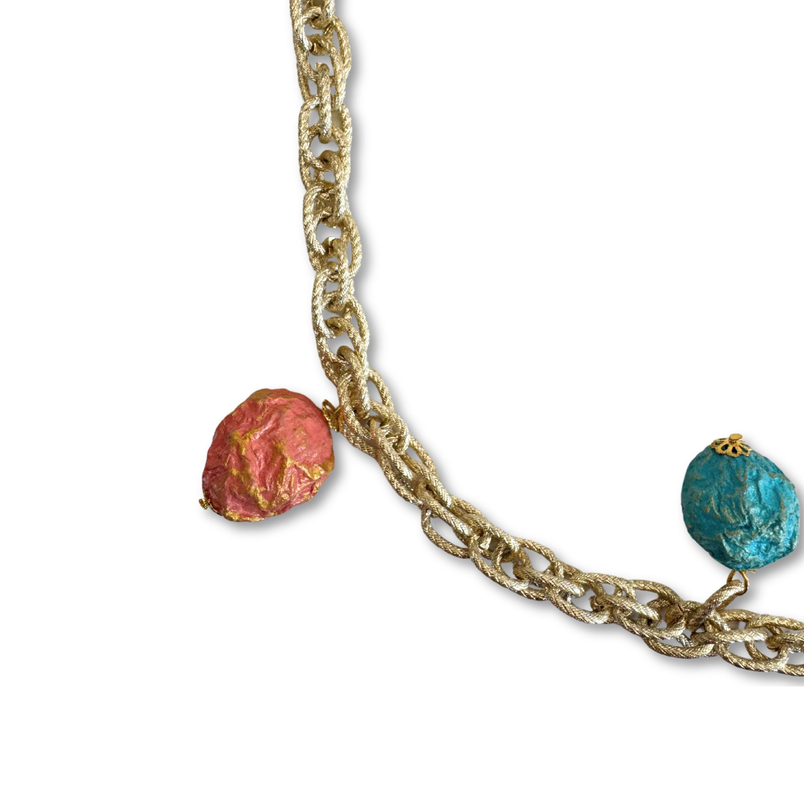 Originale, leggera e ricca di personalità, questa collana artigianale con perle in cartapesta è un accessorio unico, realizzato a mano secondo tecniche tradizionali reinterpretate in chiave contemporanea. La catena color oro, dal design intrecciato, è impreziosita da perle in cartapesta dipinte a mano, ognuna diversa per forma e sfumatura, creando un elegante gioco di colori vivaci e armoniosi.