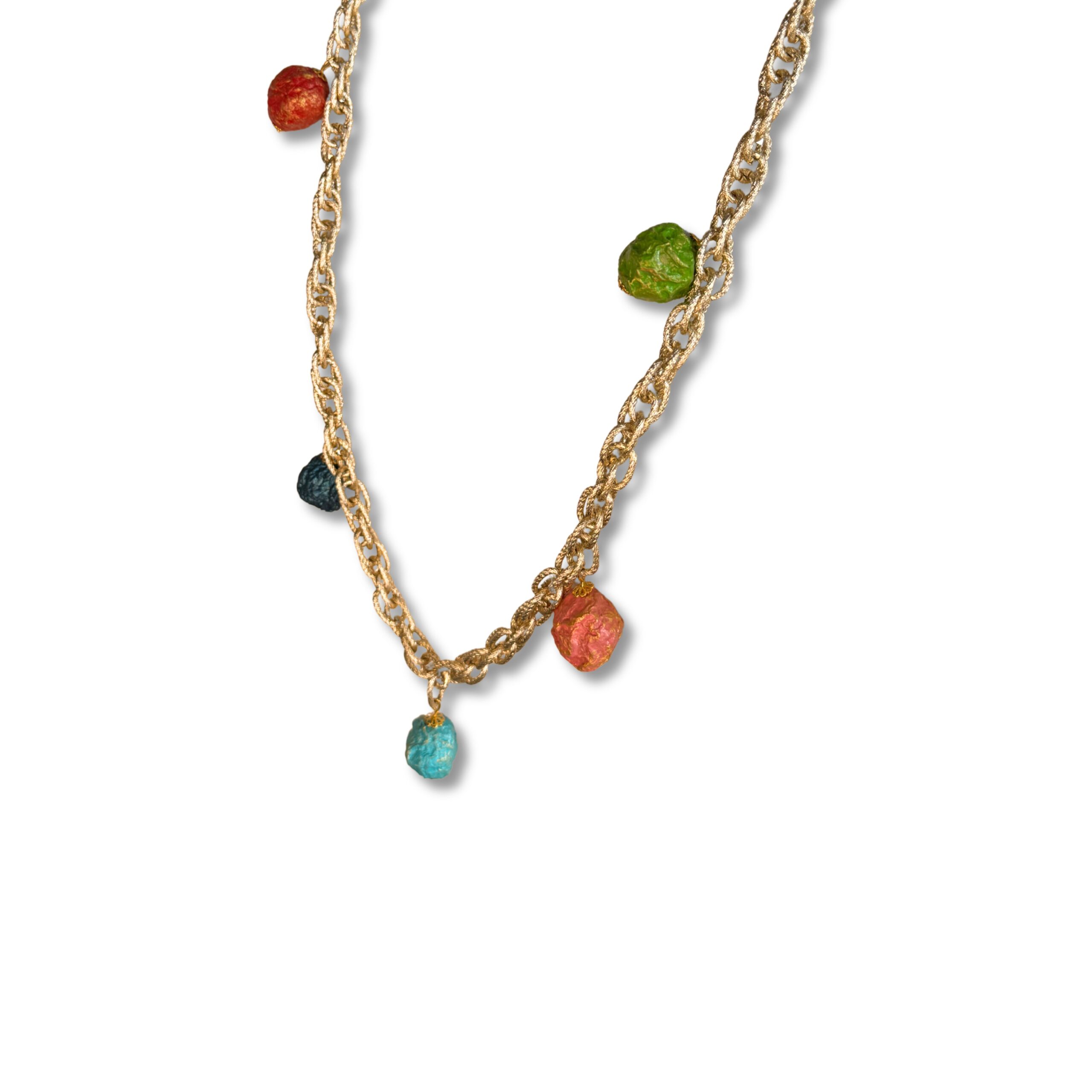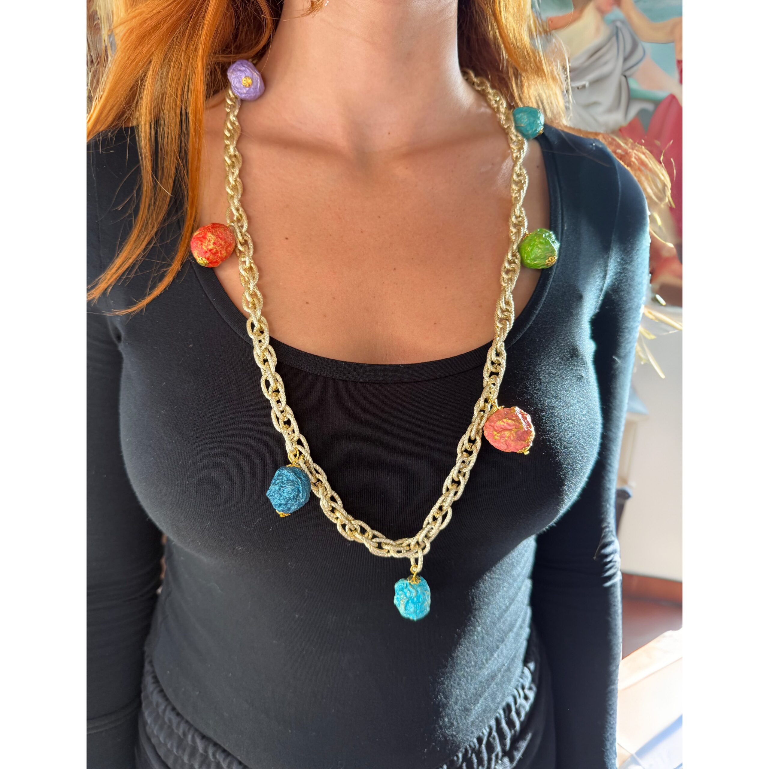 Le perle in cartapesta rendono la collana estremamente leggera e confortevole, ideale da indossare tutto il giorno. Il contrasto tra la finitura dorata della catena e le perle multicolore dona carattere e originalità, rendendo questo gioiello perfetto per valorizzare outfit sia casual che più ricercati.