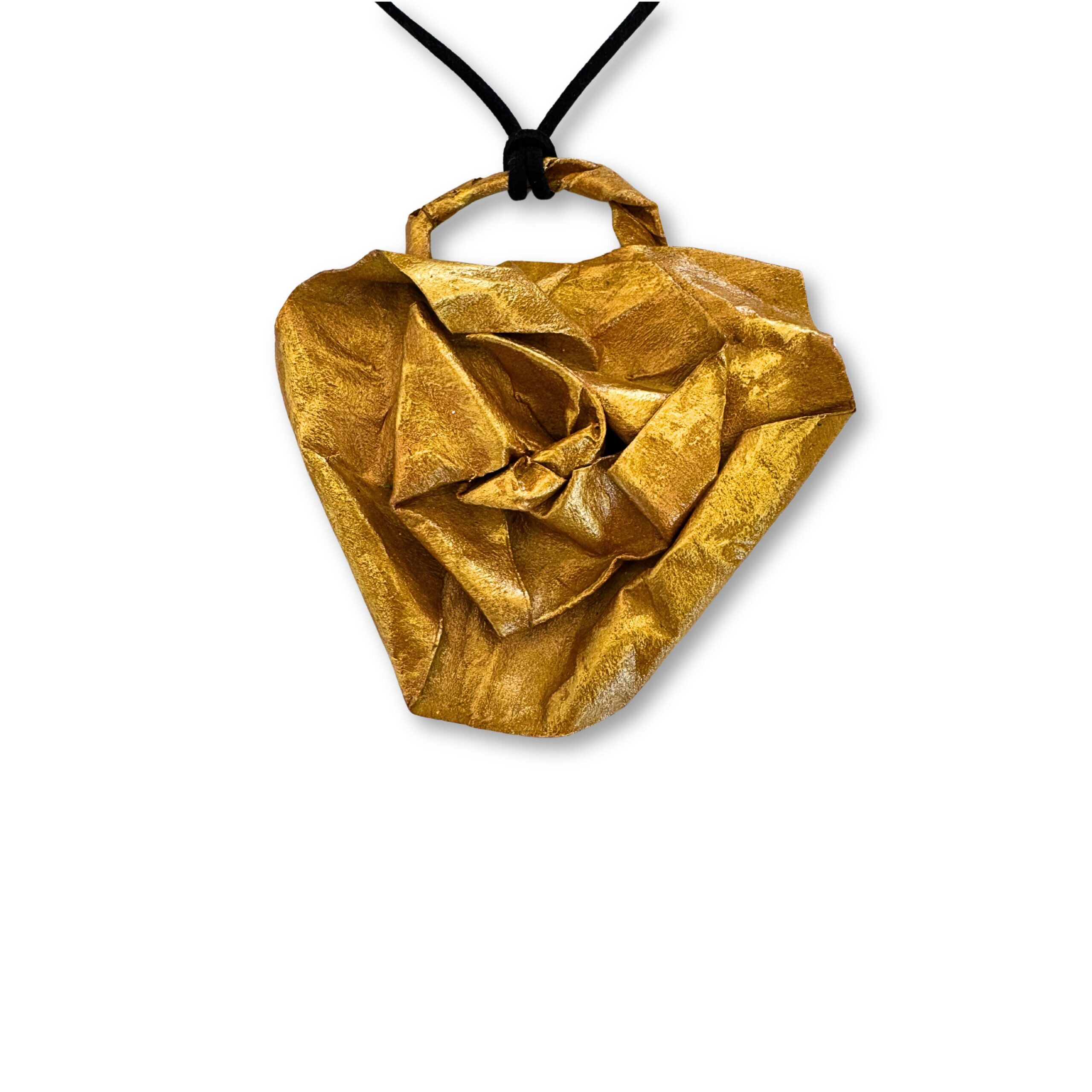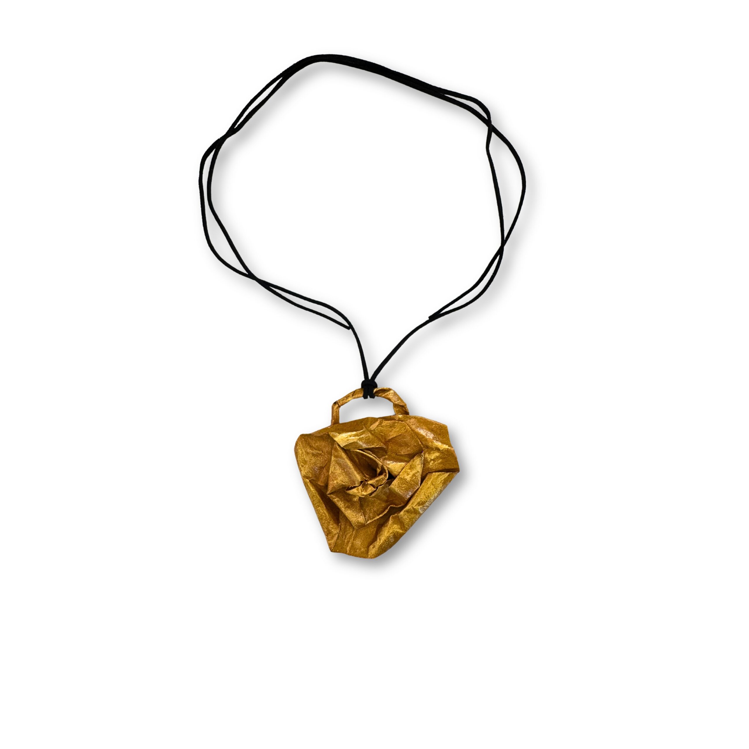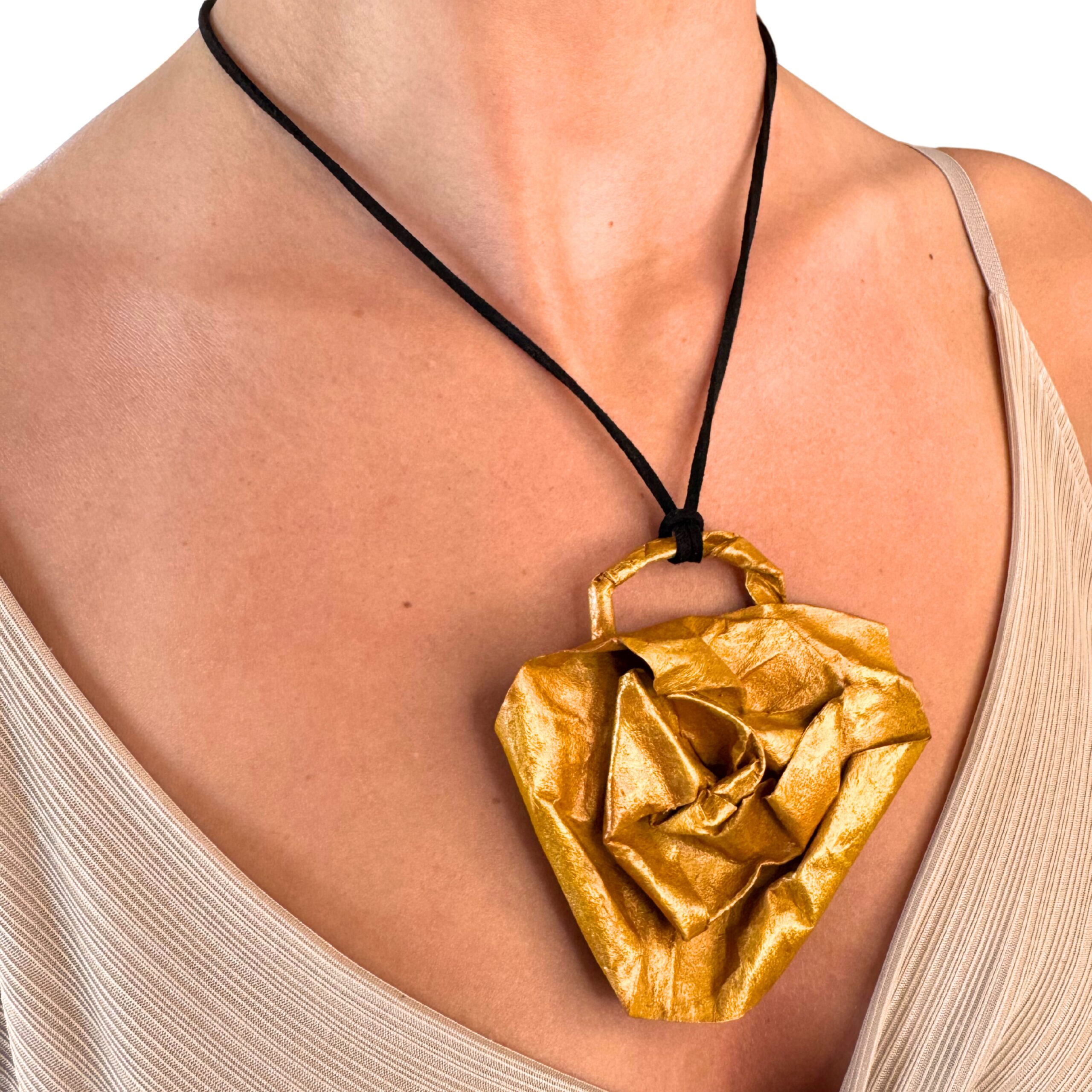 La collana è completata da un cordino nero regolabile, che permette di adattare facilmente la lunghezza e garantisce comfort durante l’uso quotidiano. La cartapesta, materiale sostenibile e creativo, rende ogni pezzo irripetibile, con leggere variazioni di texture e forma che testimoniano l’autenticità del lavoro artigianale.