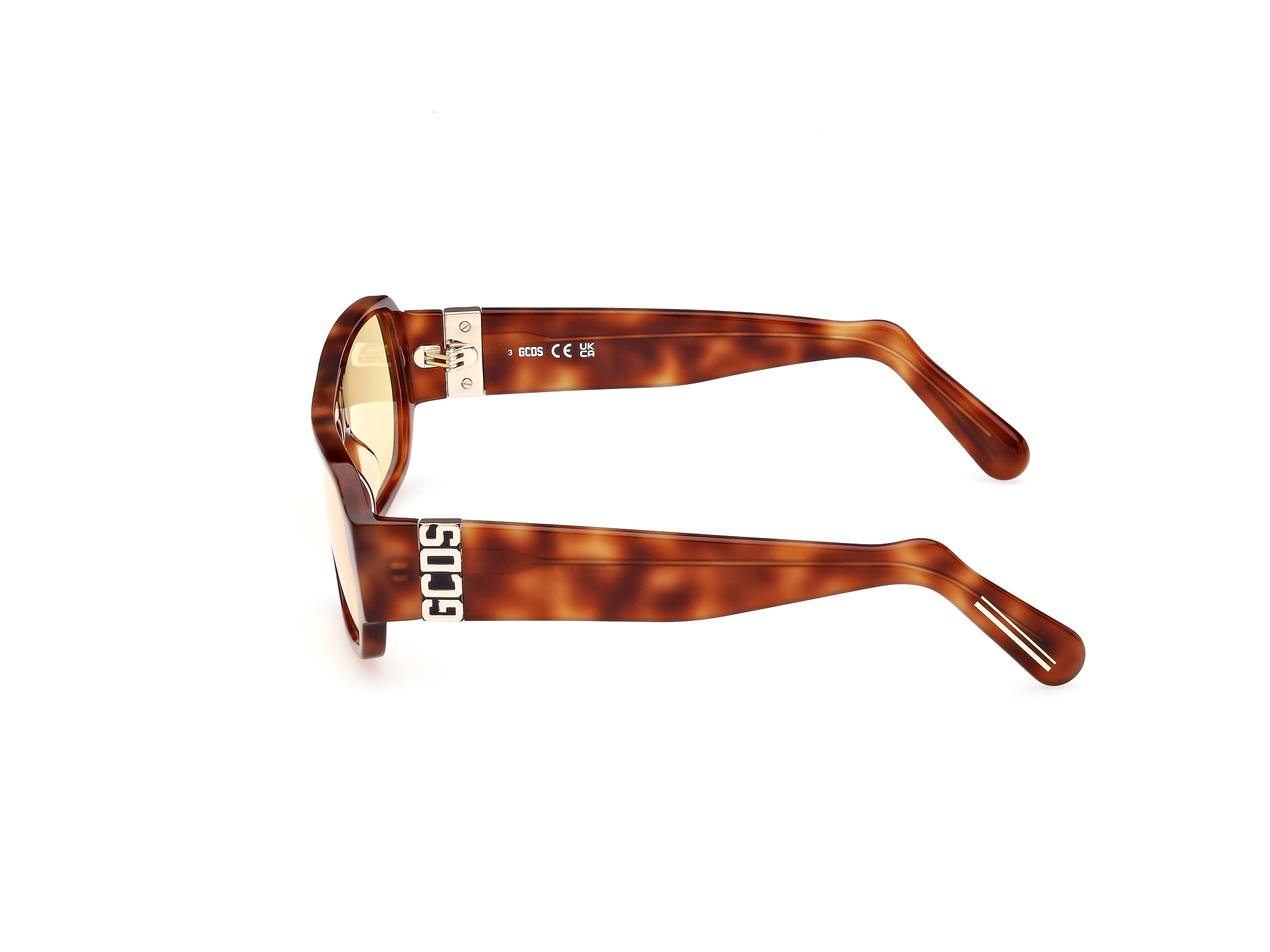 La montatura squadrata in acetato effetto tartarugato dona personalità e tendenza, mentre le lenti giallo chiaro aggiungono un tocco fashion e garantiscono protezione UV, migliorando il comfort visivo in diverse condizioni di luce. Le aste larghe con logo GCDS a contrasto completano il design con un dettaglio riconoscibile e di forte identità.