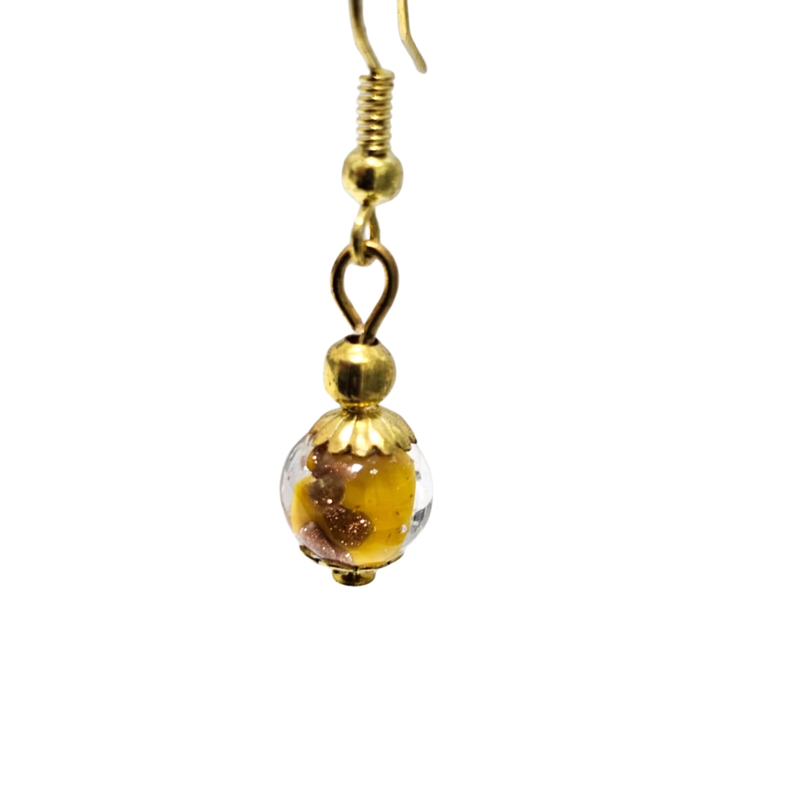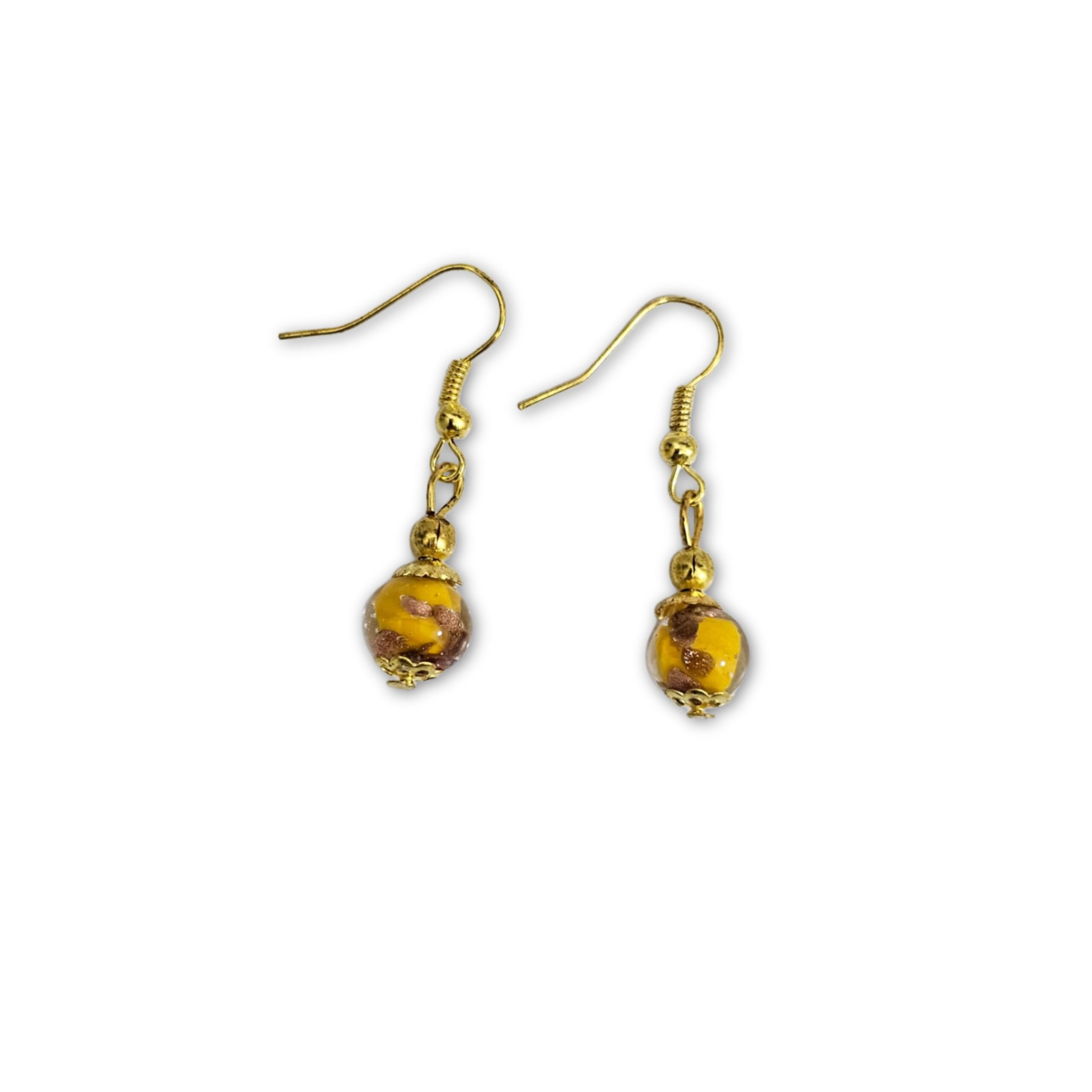 Orecchini artigianali realizzati a mano con perla in autentico vetro di Murano nelle calde tonalità del giallo, arricchita da eleganti inclusioni decorative che rendono ogni perla unica. Un gioiello luminoso e raffinato, perfetto per donare carattere e colore a qualsiasi outfit.